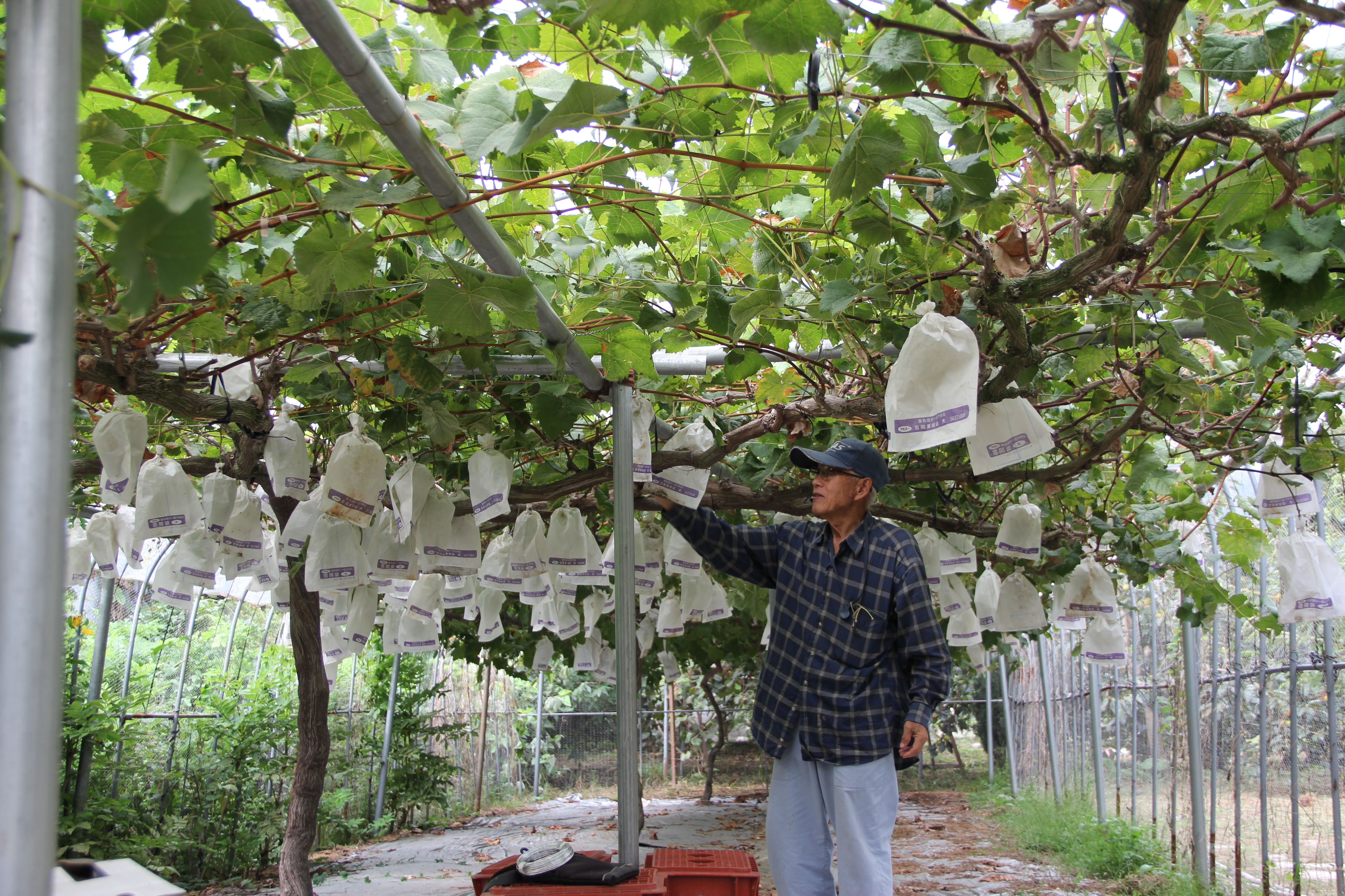 始まりは15年前。南丹市八木町に住む知人からぶどう作りを教えてもらい、小さく栽培を始めたのがきっかけでした。「その頃は自分や家族で食べるくらいのもんやった」と笑顔で語る重治さん。やがて、娘が育ててほしいと買ってきた苗「ピオーネ」や「シャインマスカット」なども手掛けるようになり、次第にブドウ畑も広がり、今ではおいしいと注目されるブドウ園に成長しました。
